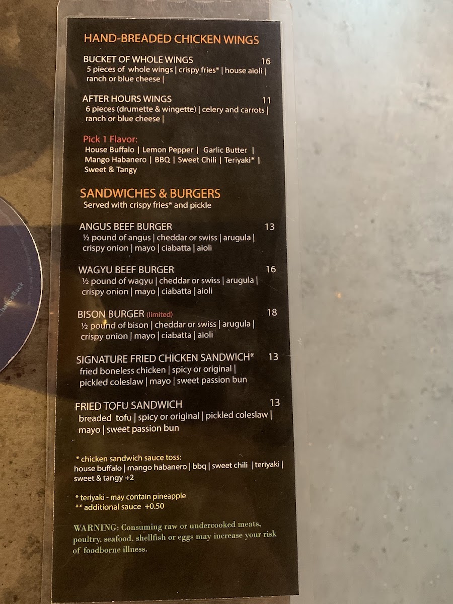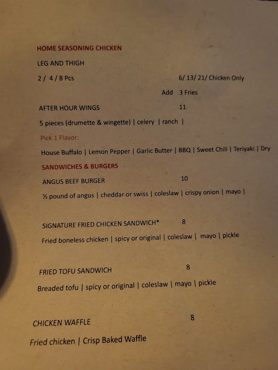 The menu features standout dishes like rich Tonkotsu Ramen and the Signature Fried Chicken Sandwich, paired with sides such as crispy fries, onion rings, or an assortment of wings. For those seeking lighter or shareable options, choices like edamame, seaweed salad, and gyoza blend well with the overall cozy and welcoming atmosphere.