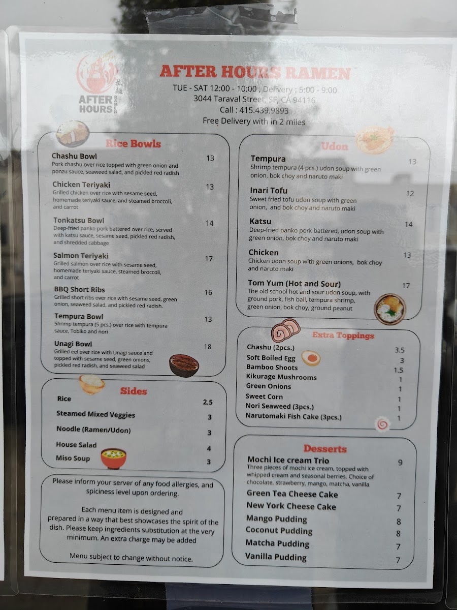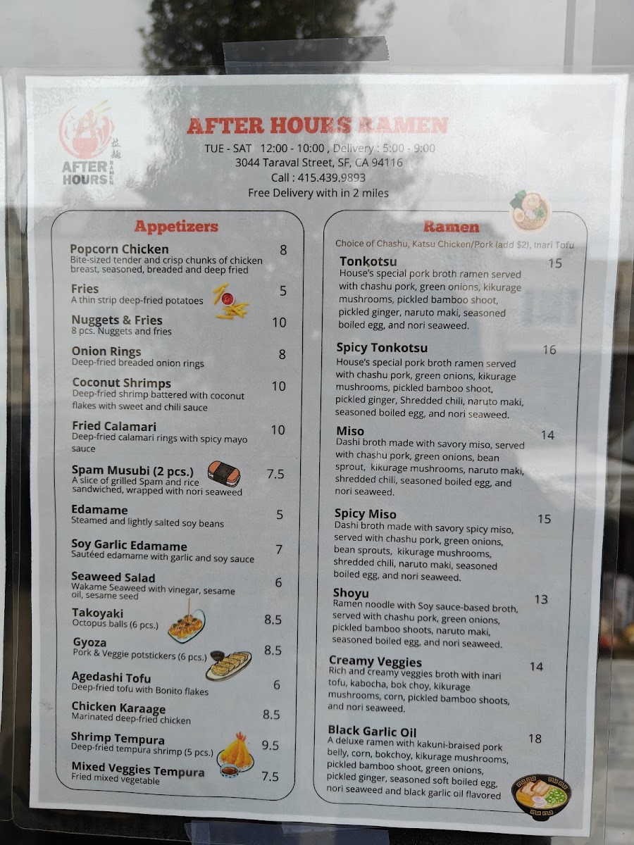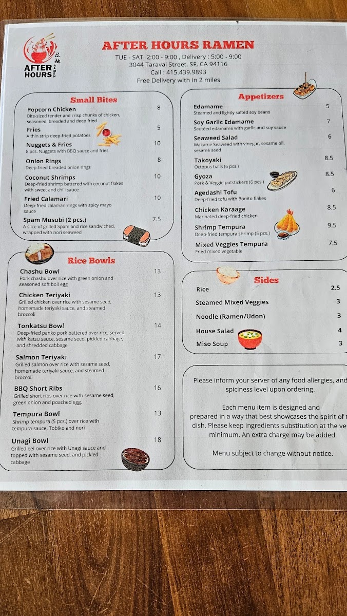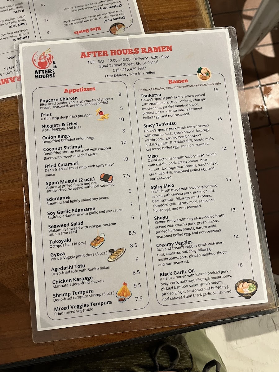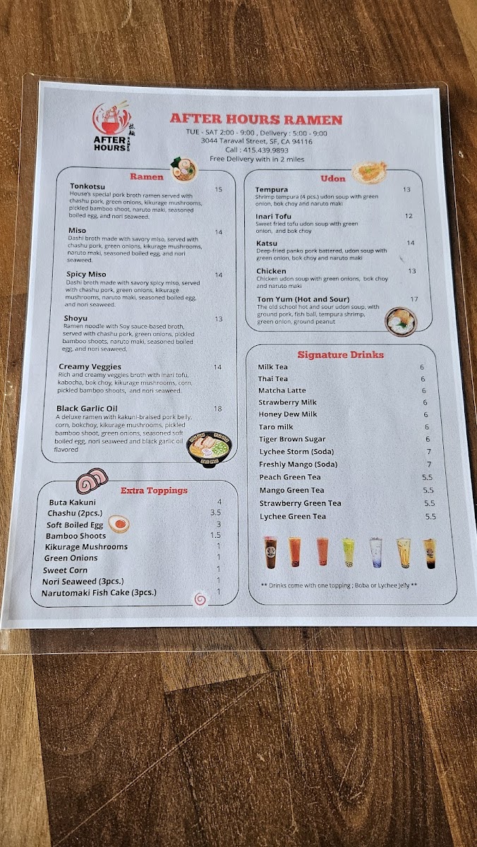 After Hours Ramen offers a straightforward menu that balances comforting bowls of ramen with a selection of casual bites and refreshing drinks. The focus is on hearty, satisfying flavors that are ideal for winding down after a busy day or enjoying a relaxed meal with friends.